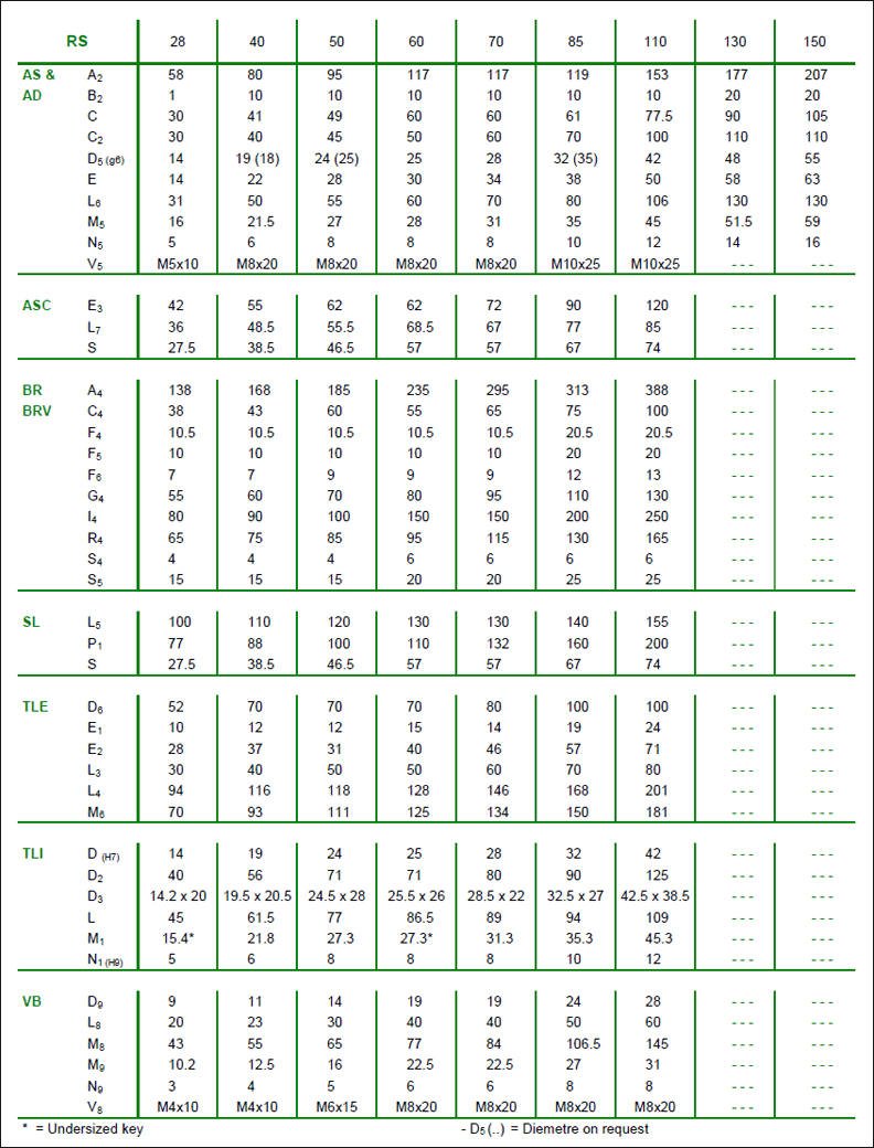 SRS28-RS28, SRS28-RS40, SRS28-RS50, SRS28-RS60, SRS40-RS70, SRS40-RS85, SRS50-RS110, SRS60-RS130, SRS70-RS150